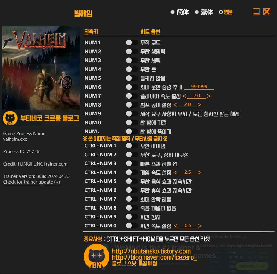 주의 사항 : 트레이너를 사용함으로 얻게되는 불이익에 대해서는 절대 책임을 지지 않습니다. 온라인, 스팀, 유플레이, 오리진, 에픽등 기타 런쳐를 사용하는 게임의 도전과제에 문제가 생길 수 있으니 이점의 유의 하시길 바랍니다. 멀티로 이용할 경우 아이디 제제를 당할 수 있으니 절대 이용하지 않길 바랍니다. 과도한 트레이너의 사용은 게임의 질을 낮추며, 재미없게 만듭니다. 사용하실때는 충분히 게임을 즐기신 다음에 사용하기를 권장합니다.