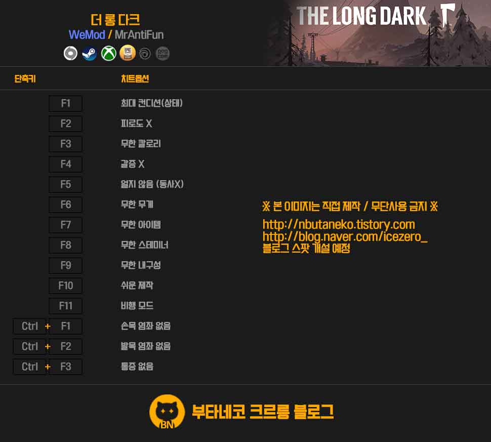 주의 사항 : 트레이너를 사용함으로 얻게되는 불이익에 대해서는 절대 책임을 지지 않습니다. 온라인, 스팀, 유플레이, 오리진, 에픽등 기타 런쳐를 사용하는 게임의 도전과제에 문제가 생길 수 있으니 이점의 유의 하시길 바랍니다. 멀티로 이용할 경우 아이디 제제를 당할 수 있으니 절대 이용하지 않길 바랍니다. 과도한 트레이너의 사용은 게임의 질을 낮추며, 재미없게 만듭니다. 사용하실때는 충분히 게임을 즐기신 다음에 사용하기를 권장합니다.